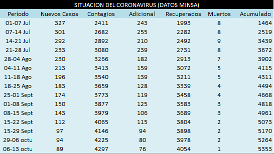 Luego de varias semanas de registrar dos muertos cada siete días, en esta ocasión la cantidad se redujo a uno, que informó de 89 casos confirmados en la semana que comprende del 06 al 13 de Octubre, según el reporte oficial del Minsa.